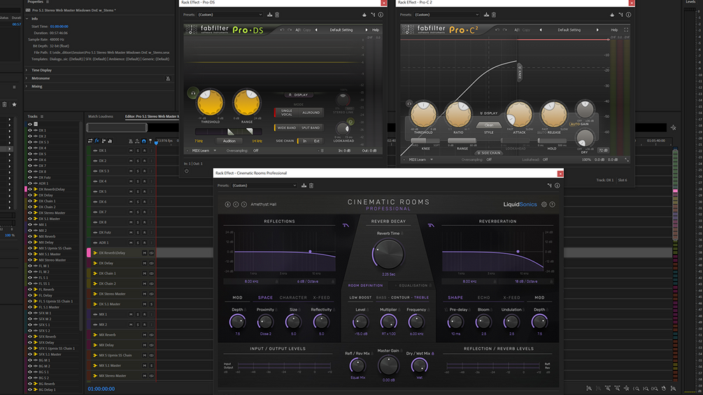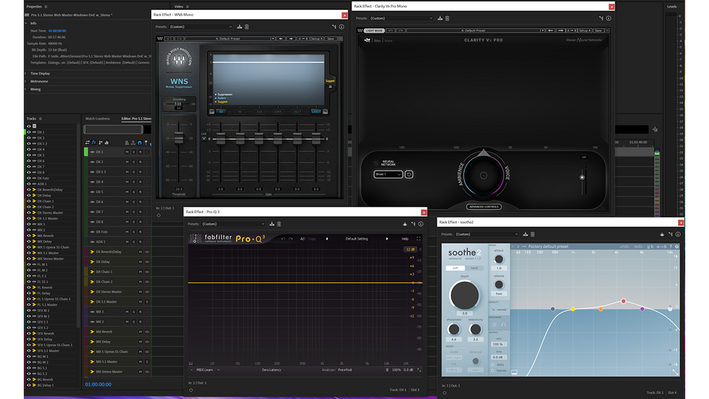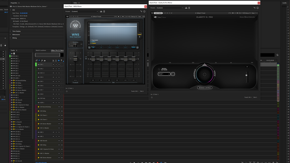 It also uses some extra plug-ins, but if you are doing this professionally you probably have them or something similar. They include Liquidsonic Cinematic Rooms, Fabfilter Bundle, Waves WNS or Clarity VX Pro, Slapper, Soothe and the Free plugin Youlean. I've only used these plugins on DX 1 and the DX Reverb/Delay tracks, all others use the stock Adobe plugins. However, I included BOTH Waves WNS and Clarity VX on the dialog tracks, so you can delete one if you don’t prefer it. The rest of the plugins should be included with Audition, but if you find one you don’t have just let me know and I can suggest alternatives.