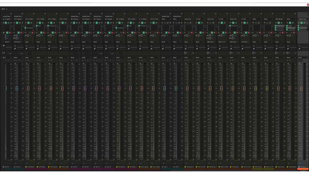 There are full stereo AND surround DME stems, mix, and MnE routing and record tracks. Tracks are labeled, grouped, color-coded, and routed to make mixing more efficient and fun. Since so many people asked for my templates I have left it “as-is” since this is what I use for every mix (with some tweaking for individual project needs).