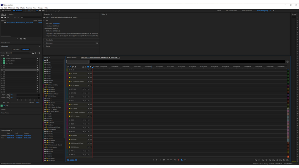 A Professional 5.1 Surround Mixdown Template in Adobe Audition 2023 Template format. This is an Audition 2023 5.1 Stereo mixdown Template. There are full stereo AND surround DME stems, mix, and MnE routing and record tracks. Tracks are labelled, grouped, color coded, and routed to make mixing more efficient and fun. Since so many people asked for my template I have left it “as-is” since this is what I use for every mix (with some tweaking for individual project needs). Remember, you are NOT buying any plugins, and I can’t guarantee you have the same version as me. If you run into any issues with plugins you may need to swap them for ones you own. But the template is a great starting point for a professional one-system mix in 5.1 and stereo.
