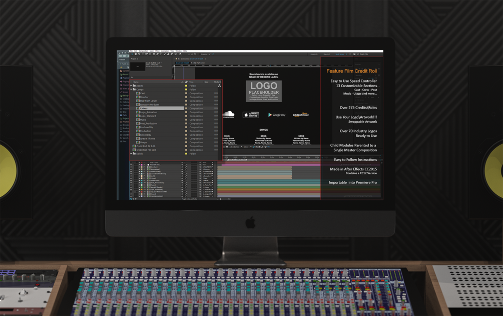 All departments are in, from DGA, PGA to IATSE, all the credits are perfectly formatted and setup per industry norms. Just type in your information. The After Effects version even includes a step by step help layer.